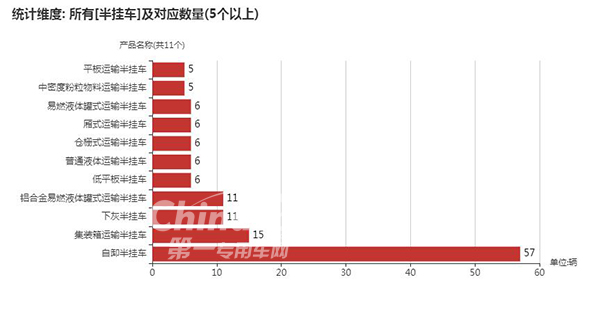 本次公告中的184款半掛車共包含38種車型,自卸半掛車(57輛)、集裝箱運輸半掛車(15輛)、鋁合金易燃液體罐式運輸半掛車(11輛)、下灰半掛車(11輛)、普通液體運輸半掛車(6輛)、倉柵式運輸半掛車(6輛)、易燃液體罐式運輸半掛車(6輛)、廂式運輸半掛車(6輛)、低平板半掛車(6輛)、平板運輸半掛車(5輛)、中密度粉粒物料運輸半掛車(5輛)、低溫液體運輸半掛車(4輛)、散裝糧食運輸半掛車(4輛)、運材半掛車(4輛)、半掛牽引車(3輛)、危險品罐箱骨架運輸半掛車(3輛)、低密度粉粒物料運輸半掛車(3輛)、腐蝕性物品罐式運輸半掛車(3輛)、平板半掛車(3輛)、鋁合金中密度粉粒物料運輸半掛車(3輛)、液化氣體運輸半掛車(2輛)、連續(xù)油管作業(yè)半掛車(2輛)、垃圾轉運半掛車(1輛)、冷藏半掛車(1輛)、瀝青運輸半掛車(1輛)、車輛運輸半掛車(1輛)、散裝飼料運輸半掛車(1輛)、純電動半掛牽引車(1輛)、變電站半掛車(1輛)、瀝青碎石同步封層半掛車(1輛)、計量檢衡半掛車(1輛)、半掛牽引汽車(1輛)、潤滑油罐式運輸半掛車(1輛)、危險品半掛牽引車(1輛)、燃料電池半掛牽引車(1輛)、翼開啟廂式半掛車(1輛)、欄板半掛車(1輛)、鋁合金運油半掛車(1輛)。