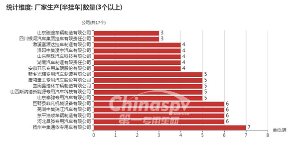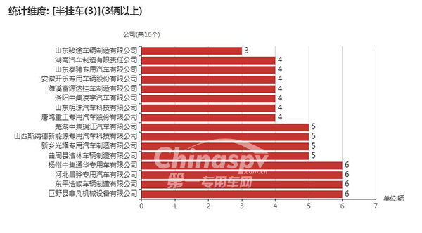 采用3軸的半掛車企業(yè)以及數量如下:河北昌驊專用汽車有限公司(6輛)、東平浩順車輛制造有限公司(6輛)、巨野縣非凡機械設備有限公司(6輛)、揚州中集通華專用車有限公司(6輛)、新鄉(xiāng)光耀專用汽車制造有限公司(5輛)、山西斯納德新能源專用汽車科技有限公司(5輛)、蕪湖中集瑞江汽車有限公司(5輛)、曲周縣浩林車輛制造有限公司(5輛)、濉溪富源達掛車制造有限公司(4輛)、洛陽中集凌宇汽車有限公司(4輛)、山東明珠汽車科技有限公司(4輛)、湖南汽車制造有限責任公司(4輛)、唐鴻重工專用汽車股份有限公司(4輛)、安徽開樂專用車輛股份有限公司(4輛)、山東泰騁專用汽車有限公司(4輛)、山東駿途車輛制造有限公司(3輛)、山東天鴻汽車科技股份有限公司(2輛)、明威專用汽車有限公司(2輛)、河南駿通車輛有限公司(2輛)、貴州云河山地汽車有限公司(2輛)、山東盛潤汽車有限公司(2輛)、山東卓越汽車科技有限公司(2輛)、山東鄆城華鄆特種車輛有限公司(2輛)、駐馬店中集華駿車輛有限公司(2輛)、山東集岳車輛有限公司(2輛)、遼寧奧伸專用車制造有限公司(2輛)、梁山中策機械制造有限公司(2輛)、新鄉(xiāng)市華爍車輛有限公司(2輛)、聊城華俊汽車制造有限公司(2輛)、梁山旭日精工機械制造有限公司(2輛)、荊門宏圖特種飛行器制造有限公司(2輛)等。