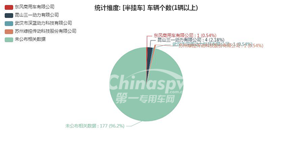 在184款半掛車中,發(fā)動機配套情況如下:東風商用車有限公司(1輛,占比0.54%)、昆山三一動力有限公司(4輛,占比2.17%)、武漢市深藍動力科技有限公司(1輛,占比0.54%)、蘇州綠控傳動科技股份有限公司(1輛,占比0.54%)、未公布相關數據(177輛,占比96.2%)。