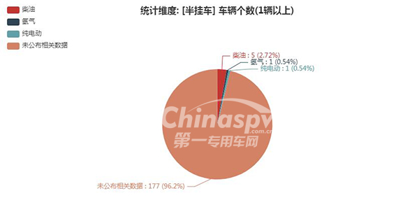 本次公告中的184款半掛車中,柴油(5輛,占比2.72%)、氫氣(1輛,占比0.54%)、純電動(1輛,占比0.54%)、未公布相關數據(177輛,占比96.2%)。