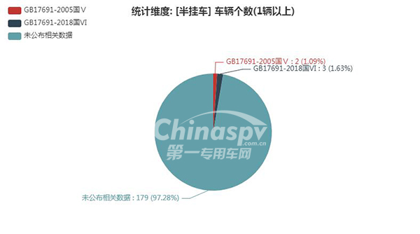 本次公告中的184款半掛車中,GB17691-2005國Ⅴ(2輛,占比1.09%)、GB17691-2018國Ⅵ(3輛,占比1.63%)、未公布相關數據(179輛,占比97.28%)。