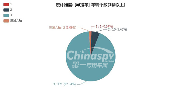 本次公告中的184款半掛車中,1軸(1輛,占比0.54%)、2軸(10輛,占比5.43%)、3軸(171輛,占比92.93%)、三線六軸(2輛,占比1.09%)。
