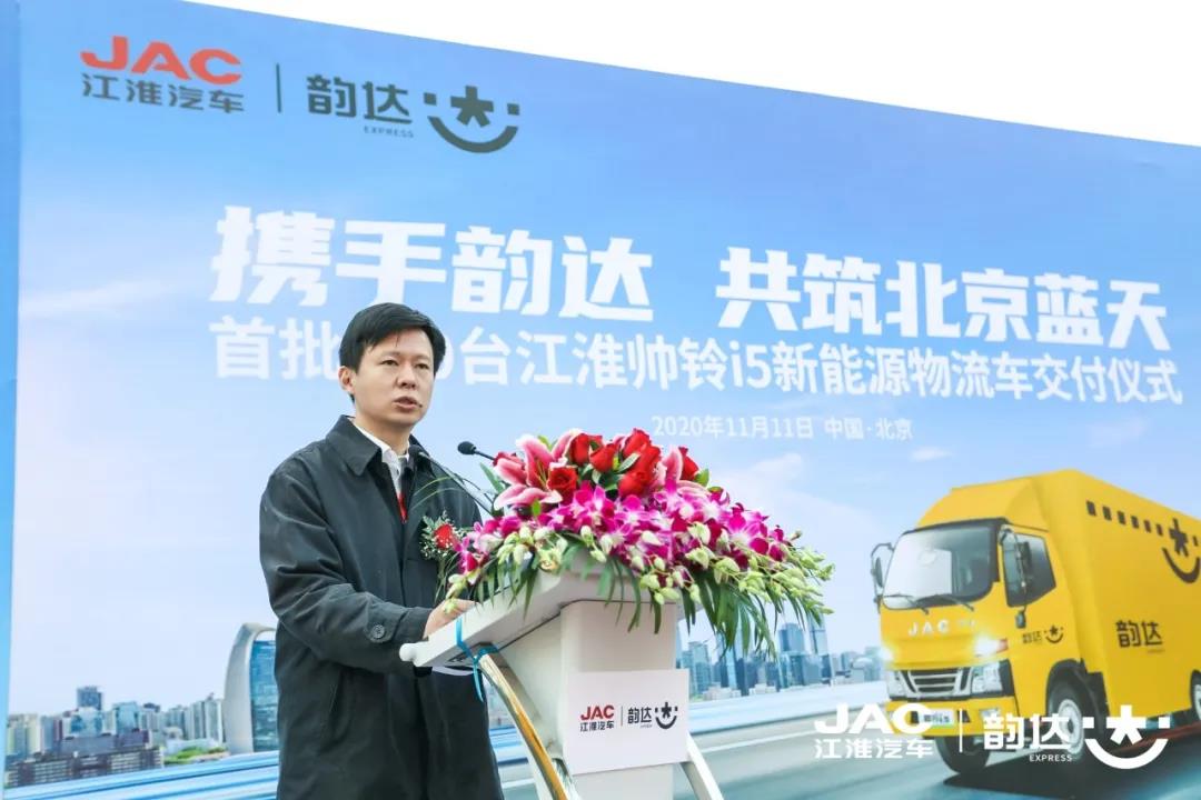 北京市郵政管理局副局長韓敬華先生現(xiàn)場致辭,他表示,目前北京全市快遞行業(yè)累計配置新能源車輛2700余輛,在全國城市處于領(lǐng)先位置,為首都的城市環(huán)境治理做出了突出的貢獻,北京韻達堅決貫徹落實市委市政府關(guān)于打贏“藍天保衛(wèi)戰(zhàn)”和“污染防治攻堅戰(zhàn)”的工作要求,于“雙11”快遞業(yè)務(wù)旺季前將100輛江淮新能源商用車集中投入使用,基本完成全年城市快遞車輛電動化的任務(wù)目標,有力踐行綠水青山就是金山銀山的理念,充分體現(xiàn)長遠的戰(zhàn)略眼光。