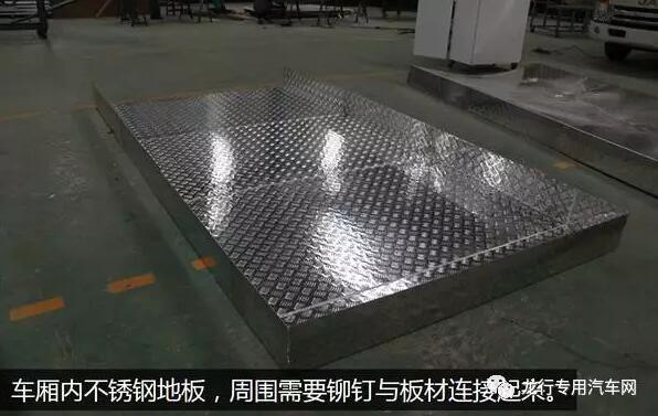 在鐵質(zhì)底座之上放一塊“三明治”板材,再放上不銹鋼地板,這三個材料組成一個完成的冷藏車廂底板。然后將其他方向的板材整合完成,鉚合處用U型鋼材、鉚釘以及膠來固定,充分保證廂內(nèi)的密封性。